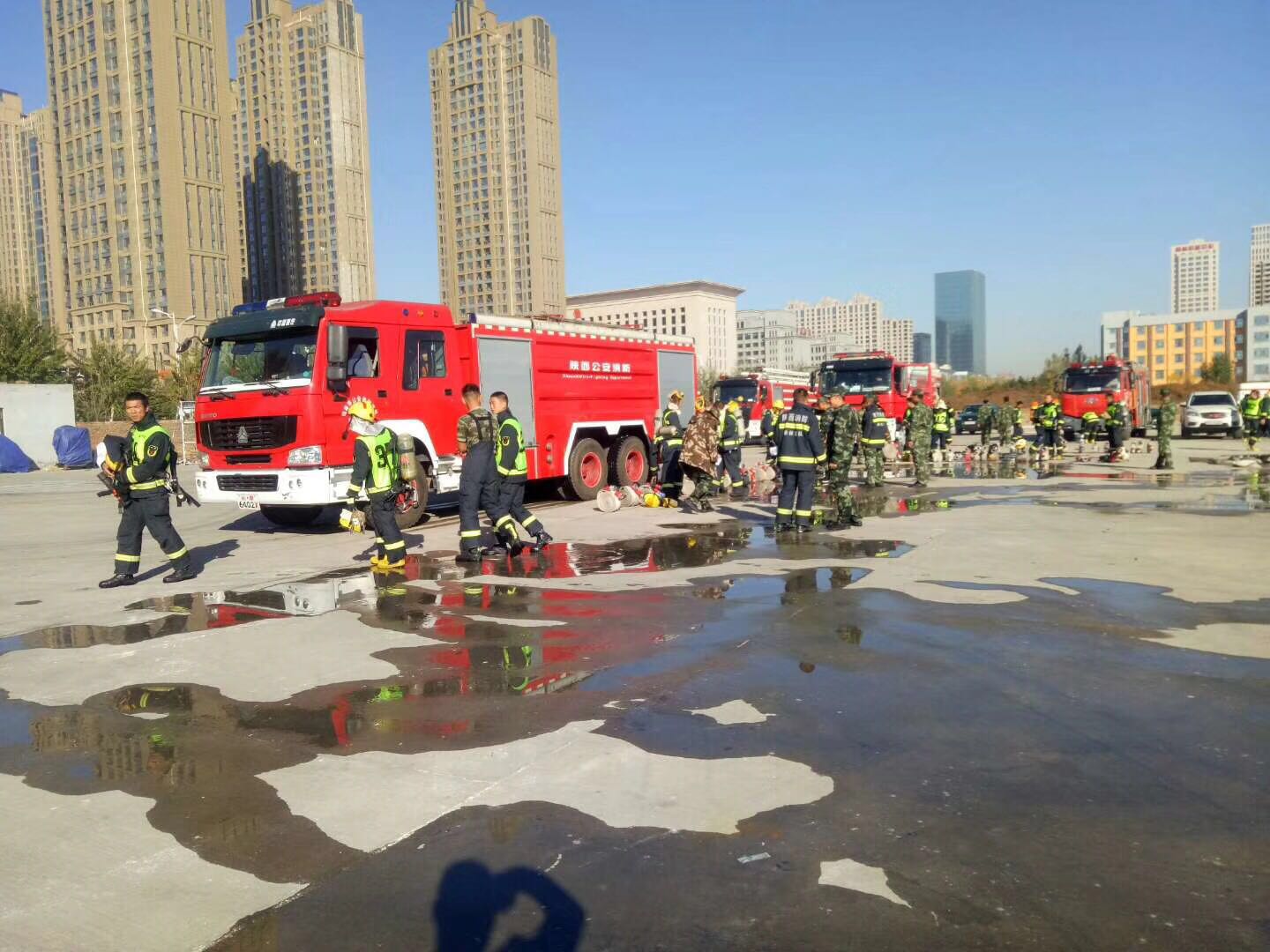 一大早、陜西榆林消防救援局在我公司采購的5臺水罐消防車、泡沫消防車等主站消防車車型便早早的開到了新區(qū)廣場附近集合、迎來首次改革后的消防工作演練、