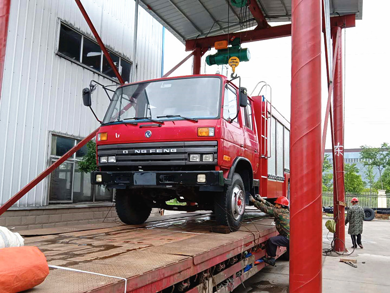 圖片為:兩臺東風救援消防車陸續開上平板車。發往目的地